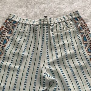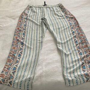 Chic pants with a unique pattern. Features white and blue with hints of green and orange.