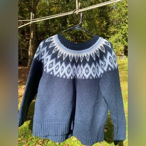 Stylish dark blue sweater with white accents. Perfect for chilly days.