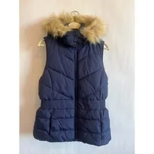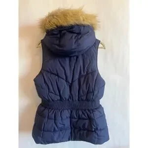 Banana Republic puffer vest with a detachable faux fur hood and a fleece lining. It is a popular style that has been sold in various colors. The vest is made of 100% polyester for both the outer shell and the insulation. It features a full-zip closure, on-seam front pockets, and an elasticized waistband.