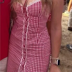 Charming gingham midi dress with lace trim. Perfect for casual outings. Has only been worn once.