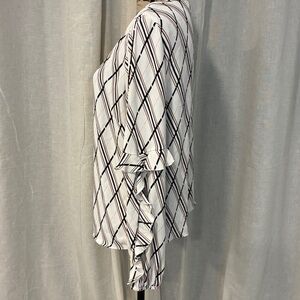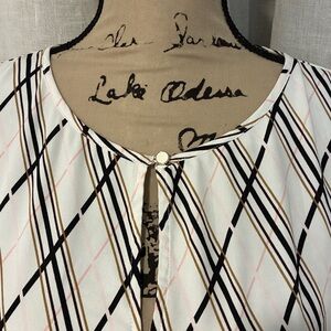 Chic blouse with geometric lines. Features a blend of black, brown, and pink accents.