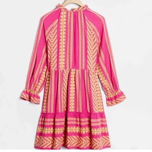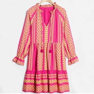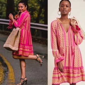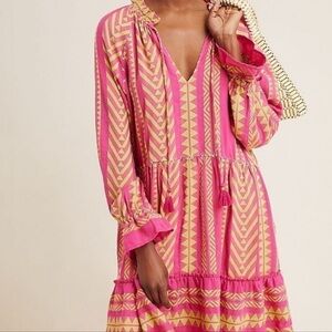 The Maeve Dominique Pink Coastal Embroidered Puff Sleeve Tunic Dress from Anthropologie is a small size, designed for women. Its vibrant pink color is beautifully contrasted with yellow embroidery, making it a perfect summer piece.
