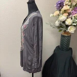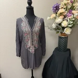 Luna Moon Gray Boho Embroidered Tunic Top L Long Sleeve Festival Fall Spring