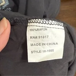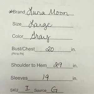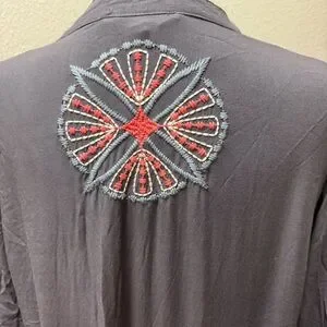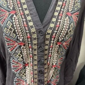 Chic Luna Moon boho embroidered tunic top in size L. Features detailed tribal embroidery in red, cream, and black across the deep V-neckline and front placket for a unique artisan look. Soft gray lightweight fabric with long sleeves makes it versatile for fall layering, spring festivals, or casual weekends. Effortlessly stylish for bohemian vibes, vacation wear, or music festivals.
