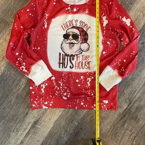 Set of two festive graphic long-sleeve shirts. One features a green tree design with text and never worn. The other has a red Santa Claus design with text and is in good pre-owned condition. Measurements shown in pictures. Price is for both shirts together!