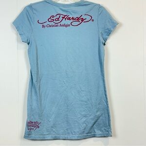 • Features: Short sleeve, fitted babydoll silhouette, large front graphic, Y2K Ed Hardy branding