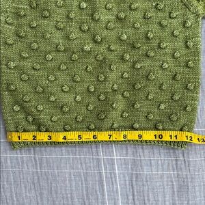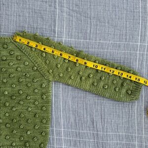 Great Misha & Puff merino wool popcorn sweater in wonderful condition, size 4-5Y. Purchased directly from them at a seasonal pop-up, I believe this lovely color is Leaf. No holes, stains, or tearing. Worn a few times over clothing, never washed. Super snuggly for cool weather. Horn button closure at back of neck. Few scattered fuzzies from storage, one tiny surface-only pull (see photo).