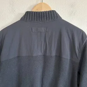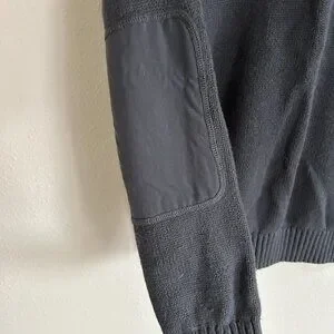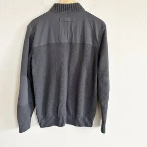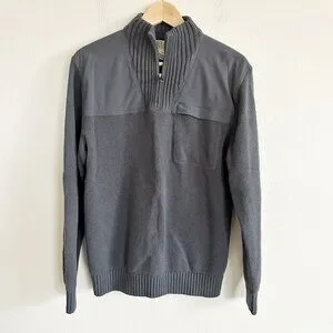 Duluth Trading Co mens size medium gray cotton wool blend knit 1/4 zip mock neck sweater with shoulder and elbow patches.