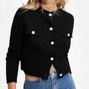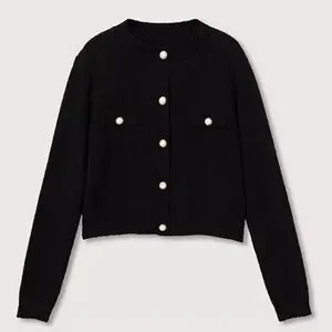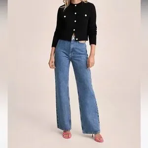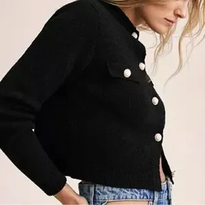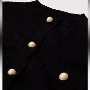 π MANGO Knitted Cardigan with Jewel Buttons crafted from cotton-blend fabric and features cable knit finish, straight and short design, rounded neck, long sleeve, decorative front flaps, jewel effect buttons, and button fastening on the front section.