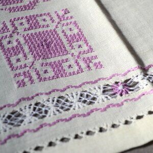 The beautiful lavender tulip motifs are on an ecru cotton background; the last photo shows the coloring the best. The stylized tulip motifs are typical of Eastern European ethnic crafts.