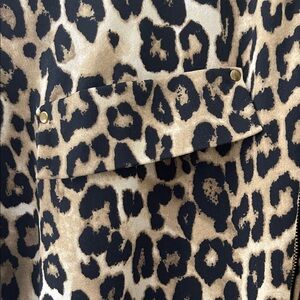 Add this stylish leopard print blouse to your wardrobe. Features 3/4 length sleeves, gold half zipper on the front, and two faux pockets on the front with gold accents. Material is soft and 95% polyester and 5% spandex. Perfect for casual outings or work.