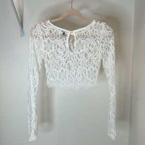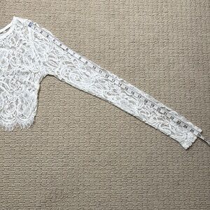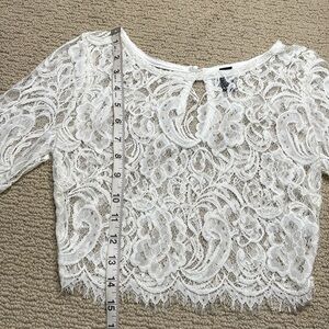 Windsor floral lace crop top. Back button closure with oval cutout. Fringe detail at the bottom. Great condition. See photos for measurements.