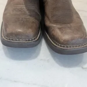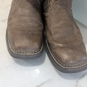 These were beautiful and still have a glimmer but they have been working boots and show it. Still would be great for working or a costume but see photos for wear mostly the teal accent. Brown leather and embroidery detail are good.