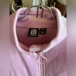 Soft pink zip-up jacket. Features a high collar and ring zipper pull. Ideal for casual wear.