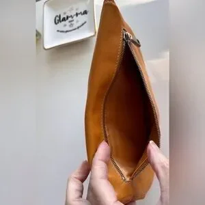 Marc Jacobs clutch in rich supple caramel tan leather. Features a MJ silver punch clasp and side phone zipper.