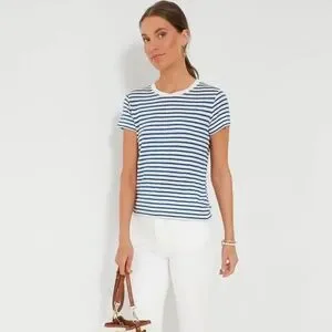 You can never go wrong with a basic tee and the Blue and White Prospect in Stripe delivers. It boasts a vintage fit that's shrunken but not tight with shorter cap sleeves and a contrast band collar. Plus, the combination of linen and rayon creates a great drape that is comfortable and flattering. Pair with denim or cut offs for a fun filled weekend adventure!