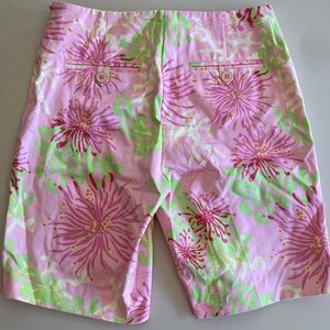 Classic Lilly Pulitzer resort fit Bermuda shorts with vibrant pink and green tropical design. Feminine and playful style.