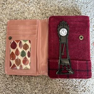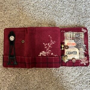 Unique burgundy fabric wallet featuring a bird patch and decorative buttons. Perfect for adding a touch of autumn style.