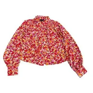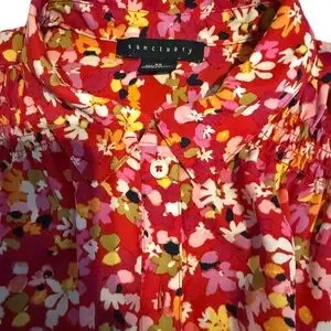 Elevate your style with this Sanctuary blouse. Features a vibrant floral design in red, pink, and yellow. Perfect for any occasion. This blouse is slightly cropped