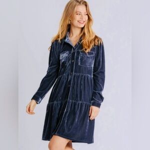 Umgee Crushed Velvet Button Down Boutique Tiered Dress Steel Blue Size LARGE