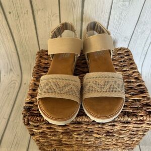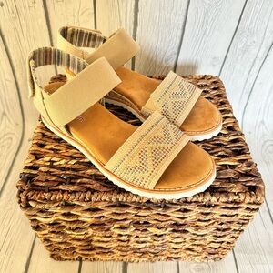 Like new condition—No “toe” marks—1 1/4 inch built in heel. Rhinestones with multi color effect in a zigzag pattern. Strappy casual comfort sandal design. Memory Foam cushioned and contoured comfort footbed. Ankle strap with adjustable heel strap panel. Comes with original box.