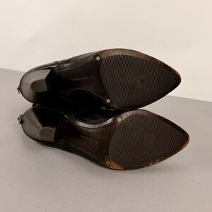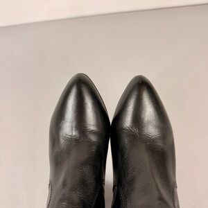 Frye Regina black leather back zip boots. Almond shaped toe. Rubber ribbed outsole pad on underfoot for traction.