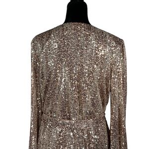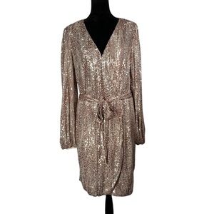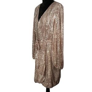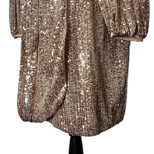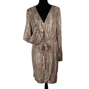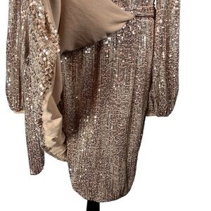 Venus Beige Sequin Cocktail Dress Faux Wrap Tan Metallic V-Neck Balloon Sleeves