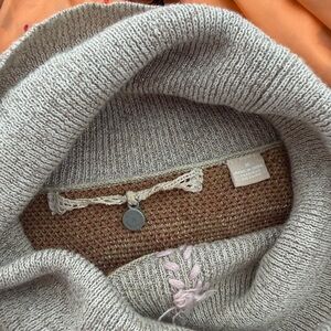 Metallic sparkly oatmeal stretch knit w/ embroidery & sequin accents, wide bell sleeves & turtleneck.