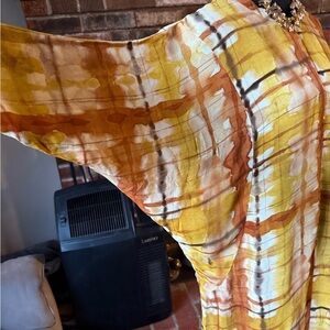 Stylish Zara midi dress with a vibrant yellow and brown pattern. Features a unique design
