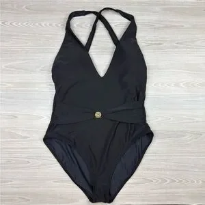 L'AGENCE Lisa Plunge One-Piece Swimsuit Black Gold Coin Size XL