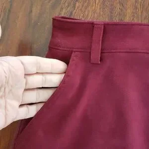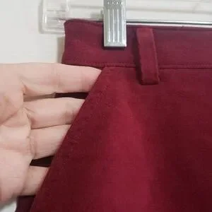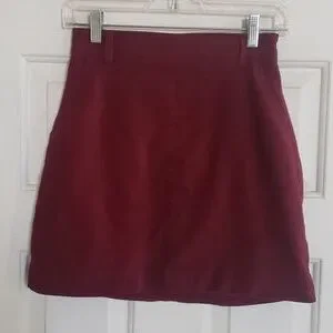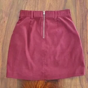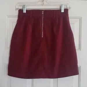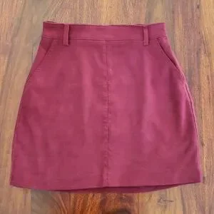 Stylish faux suede skirt, sooo soft. Perfect for any occasion. Sleek chic minimalist. Burgundy wine Bordeaux deep red garnet maroon color. Flat Front, with slant pockets at either hip. High-waisted, belt loops to pair with your favorite belt. Exposed gunmetal silver zipper in back gives an edgy vibe. Waist 24" Length 17.5" GUC