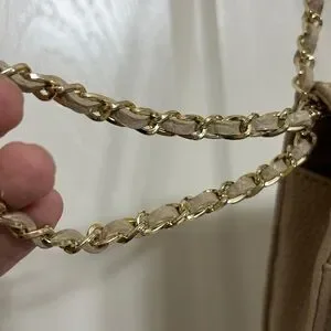 Stylish beige quilted crossbody bag with chain strap. Perfect for any occasion.