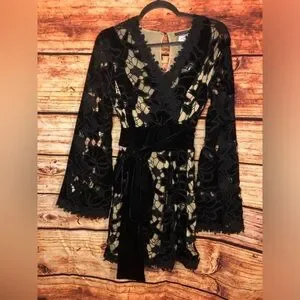 Floral velvet cut out detail. Tie waist to create the perfect silhouette. Flare sleeves. Illusion dress with nude lining. Zipper back entry.