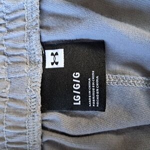 The product is a pair of men's athletic pants from Under Armour in size Large, featuring a solid gray color and a drawstring closure for a personalized fit. These joggers are designed for both activewear and casual occasions, with an elastic waist and pockets for added comfort and convenience. The athletic fit and jogger style make them perfect for both sports and athleisure activities, making them a versatile addition to any man's wardrobe. Machine washable for easy care, these pants are ideal for the winter, fall, and spring seasons.