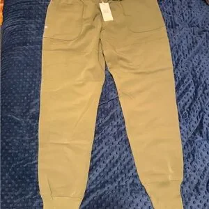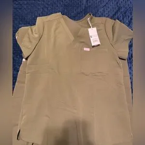 Figs brand sage green scrub top and jogger pants. Ideal for active professionals. Modern and comfortable fit.