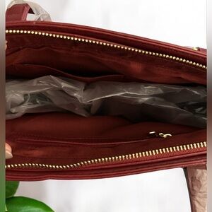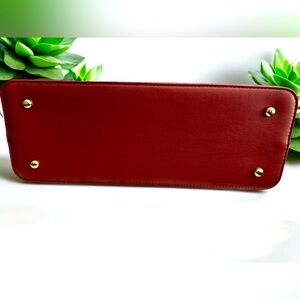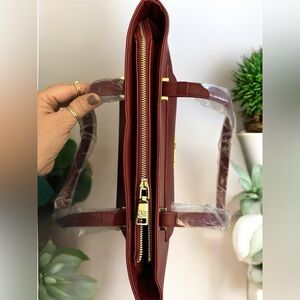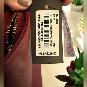 Gorgeous NWT Badgkey Mischka burgundy tote featuring silver iconic Badgkey Mishka signature overlaid BM hardware on the front of an exterior magnetic snap pocket and gorgeous supple vegan leather. The interior has a zip pocket above the Badgley Mishka name stamp and two slip pockets.