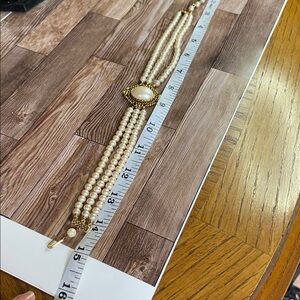 Triple-strand pearl necklace featuring a gold accent centerpiece.