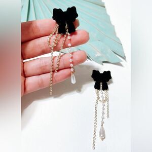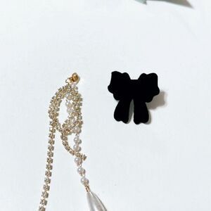 Black velvet bow stud crystal drop earrings in gold tone hardware