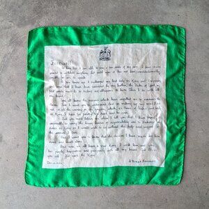 This handkerchief reproduces the handwritten letter of King Edward VIII addressing the British People and the Commonwealth following his abdication which allowed him to marry Walis Simpson and move into exile as the Duke of Windsor.