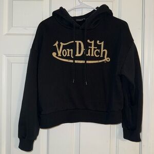 Slightly cropped hoodie. Black fleece lined hoodie with drawstring, light tan Von Dutch logo. Like new condition. Women’s size M.