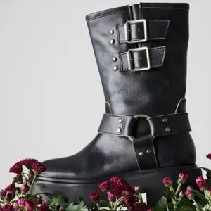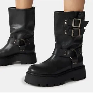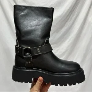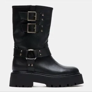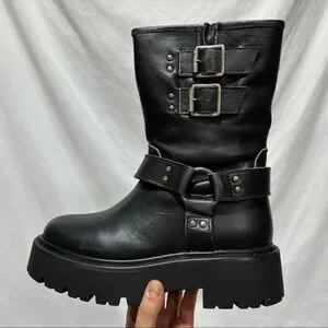 Steve Madden Reika Black Leather Buckle Hardware Motorcycle Combat Boots Goth