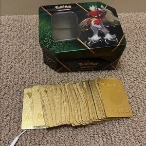 Pokemon tin featuring a collection of gold cards. Eye-catching design with green accents. Ideal for fans and collectors. Over 100 cards plus tin case