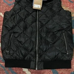 Stylish black quilted vest. Features zippered pockets. Perfect for layering.