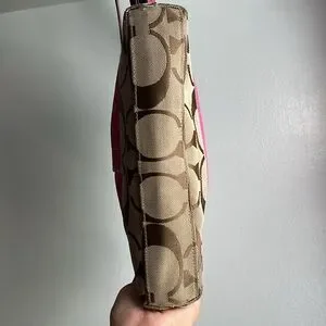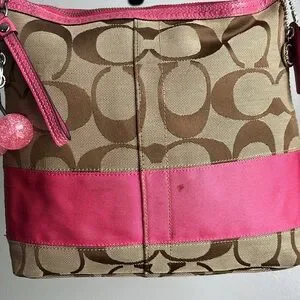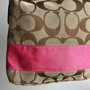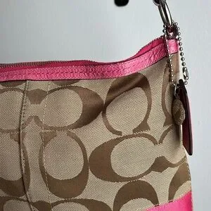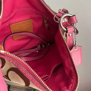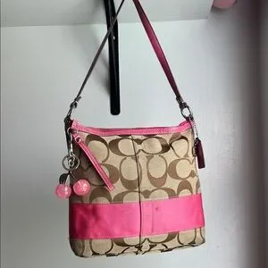 Stylish Coach shoulder bag with signature pattern. Features vibrant pink accents. Perfect for everyday use. In great used condition, has been so so loved but still lots of life left in her! Beautiful and practical, comes with the longer strap to be used as a crossbody. Will come the pink charm π great bag for the fall ππ