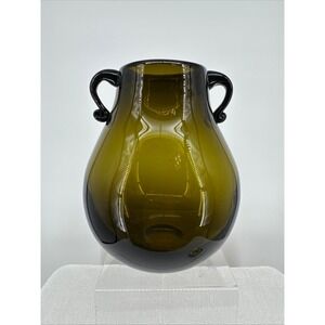 Vtg Olive Green Blown Glass Vase Black Handles Decorative Amphora Home Decor