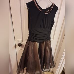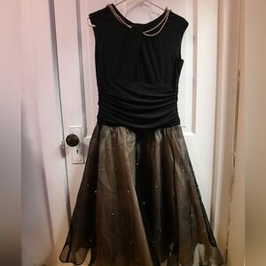 This stunning black midi dress features a sleeveless design with a flattering v-neckline and a fit and flare silhouette. The dress is adorned with a sheer black overlay that adds a touch of sparkle, making it perfect for a prom or cocktail event. Its elegant style and sophisticated details ensure you stand out on any special occasion.