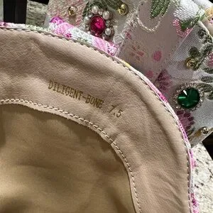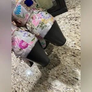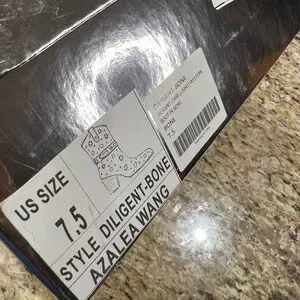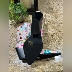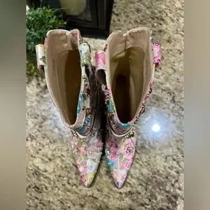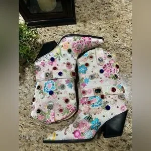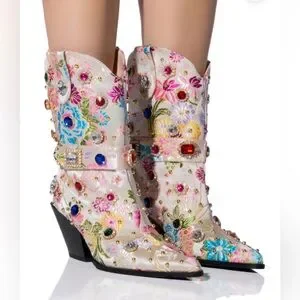 AZALEA WANG DILIGENT EMBELLISHED BASIC CHUNKY BOOTIE IN BONE. Sz 7.5. NWT in box. This is an Azalea Wang Diligent Embroidered Western Boot in a floral-patterned brocade with studded and rhinestone gem embellishments. Luxurious beige interior. Smooth fabric finish. Iconic Azalea Wang design. The AZALEA WANG Diligent Gem Embellished Brocade Western Bootie In Bone is made from a floral-patterned brocade upper and features studded and rhinestone gem embellishments, a coordinating velcro belt detail, a rounded, Western-inspired silhouette, a mid-calf height shaft, a pointed toe design, pull tabs, a chunky heel, and a pull-on fit. Fast shipping!