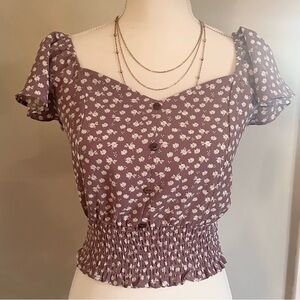 Chic floral blouse with heart neckline with elastic edge across backside so it’s drapes nicely across shoulders and chest. Button detail down front. Smocked waist for a flattering fit. 😍