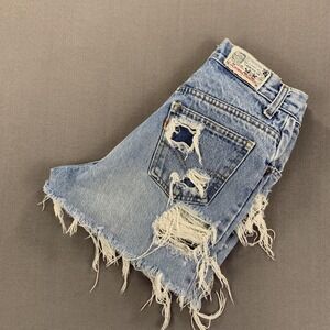 Notes: These appear to be cutoffs with intentional/designed distressing; raw hems may continue to fray with wear.