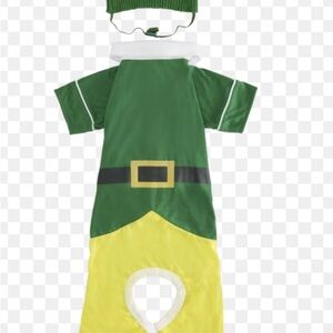 Festive elf costume for dogs. Green body with yellow accents. Includes matching hat. Perfect for holiday fun.